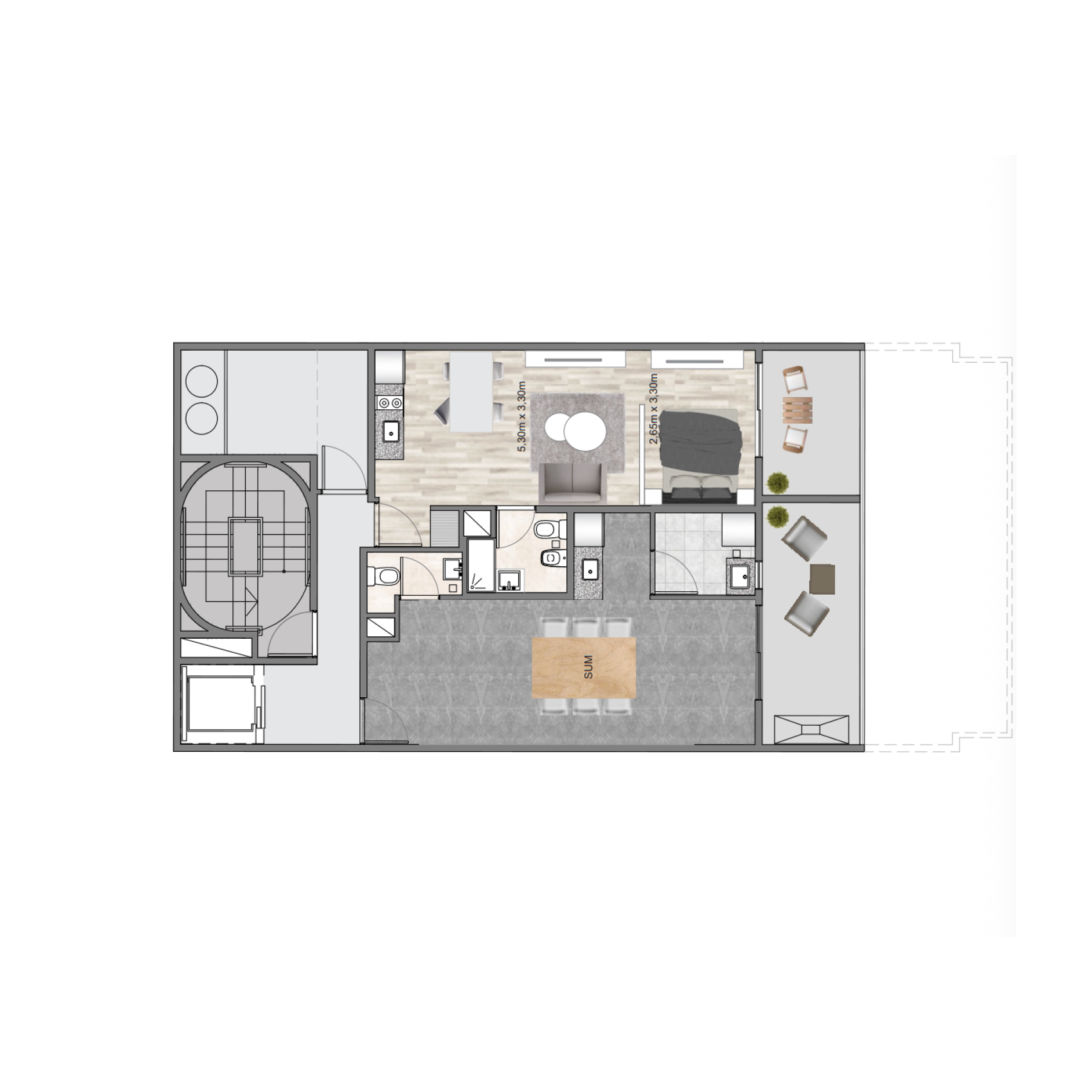 El edificio incorpora SUM y local comercial en planta baja, sumando practicidad y dinamismo al proyecto.